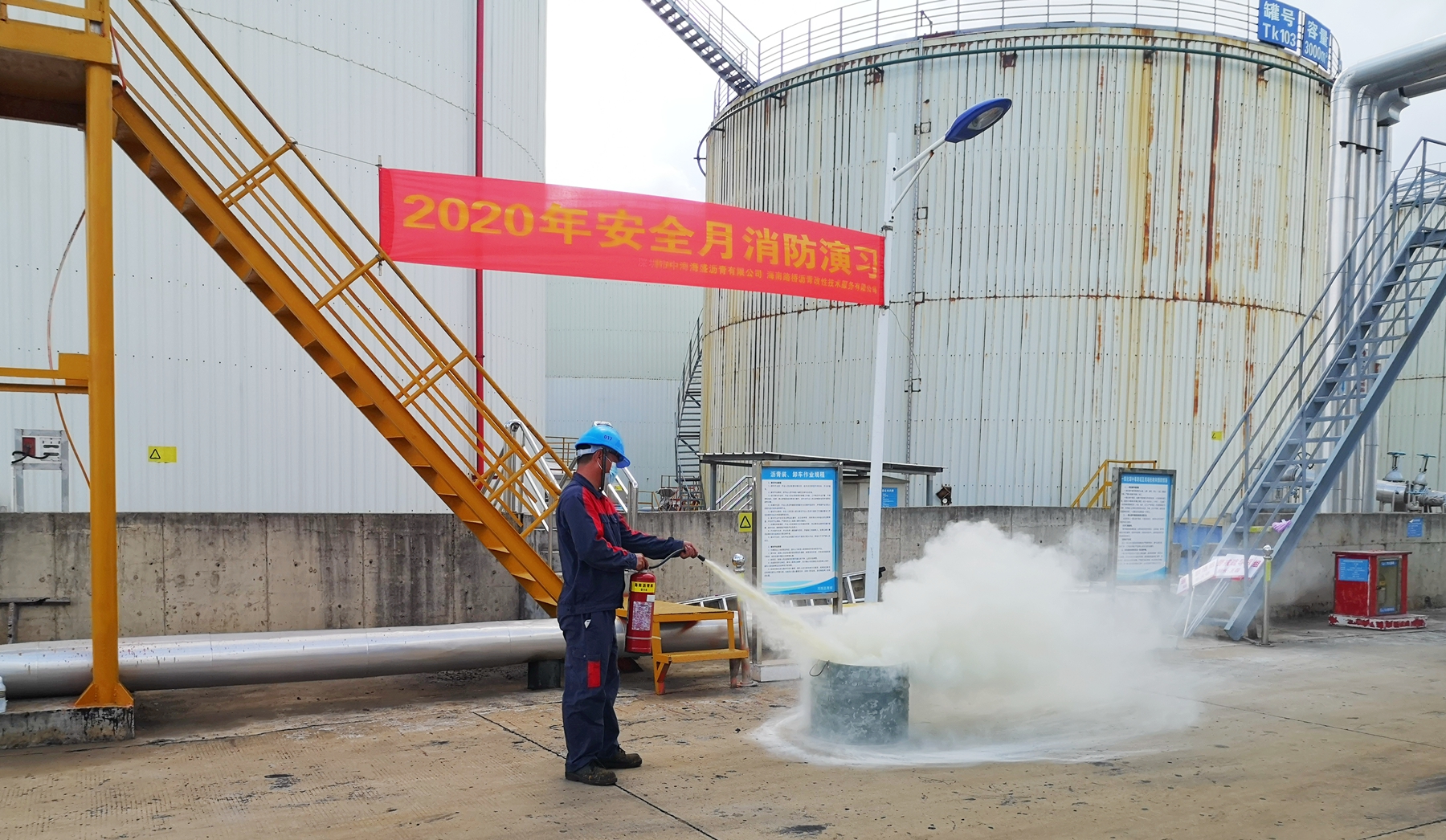 为了加强安全管理,提高员工处理突发事件的应变能力,路桥沥青公司于6月19日下午在厂区举行2020年度安全月消防演练,进行了应急疏散,伤员救治,干粉灭火器扑灭油类火灾和消防水灭火等科目演练活动。