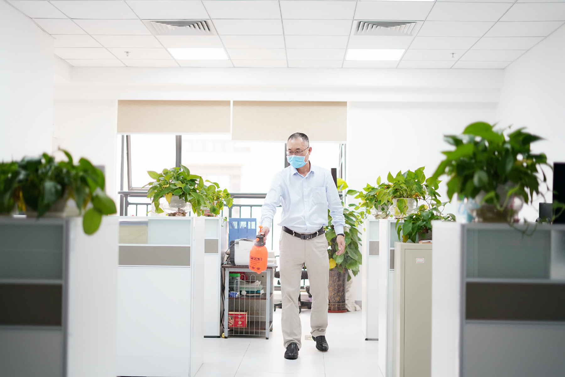 图为:每日下班前对办公区域进行消毒工作