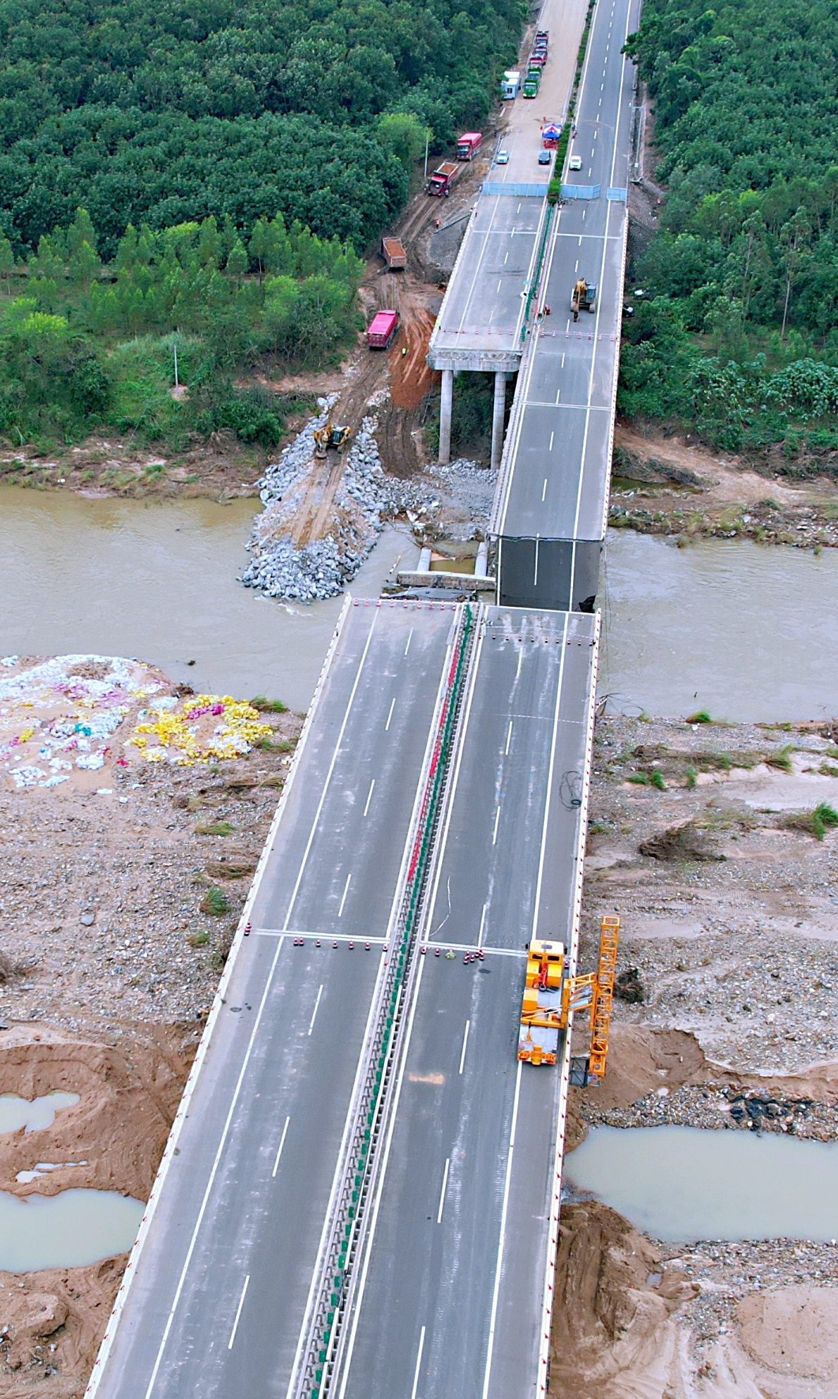 10月10日上午,受今年17号台风“狮子山”影响,环岛高速K453+900珠碧江大桥因强降雨冲刷导致桥墩水毁严重,右幅5、6、7跨沉陷,5、6号墩严重下降和外倾,桥面沉陷,随时可能倒塌,危及相连桥面及临近左幅桥梁安全,情况非常危急。